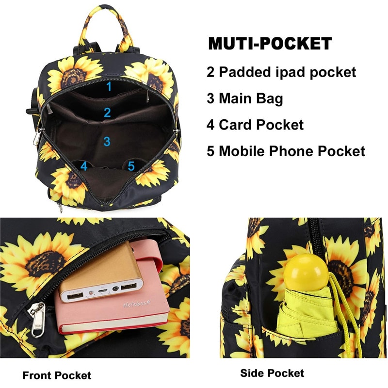 Sunflower Pattern Backpack: Made from durable water resistant polyester.