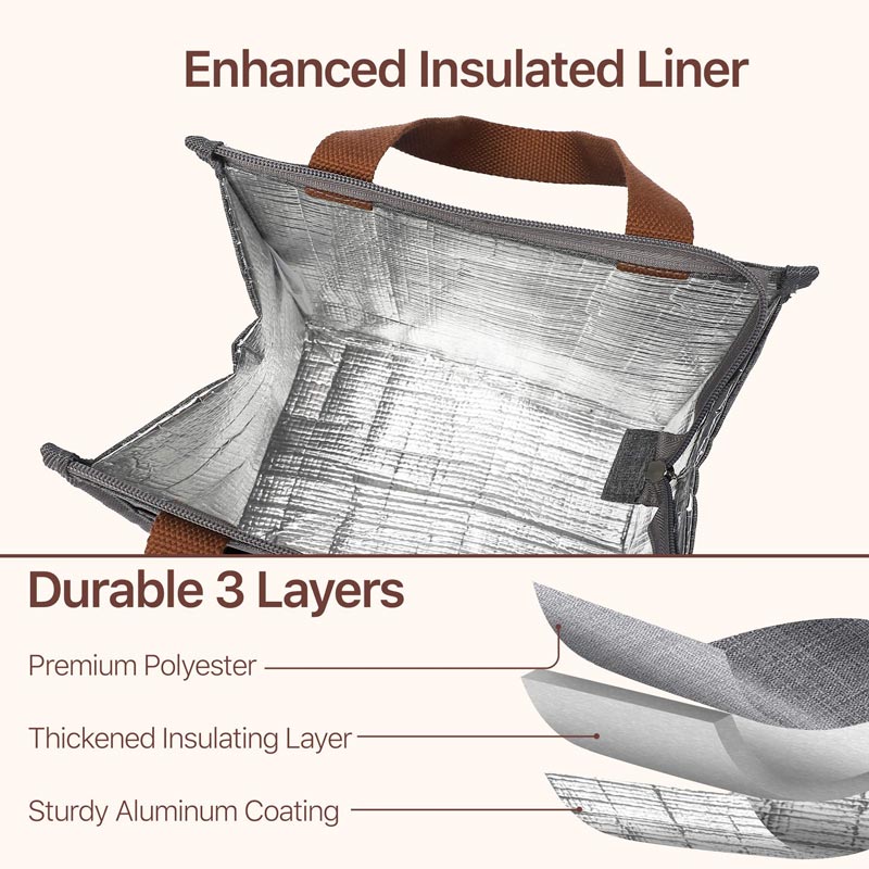 Simple Style Lunch Bag: Insulated lunch bag is made FREE from PVC, BPA, phthalate & lead materials. Premium reinforced metal SBS dual zip, secure zip closure and metal buckle ensure smooth open, rip-resistant & maximum durability. Thick aluminum foil liner is easy to clean. If sauce spills inside, just wipe it off with wet cloth or napkins. Premium composite waterproof fabric is resistant to dirty and abrasion, protecting your lunch and items inside from occasional splatters or light rain.