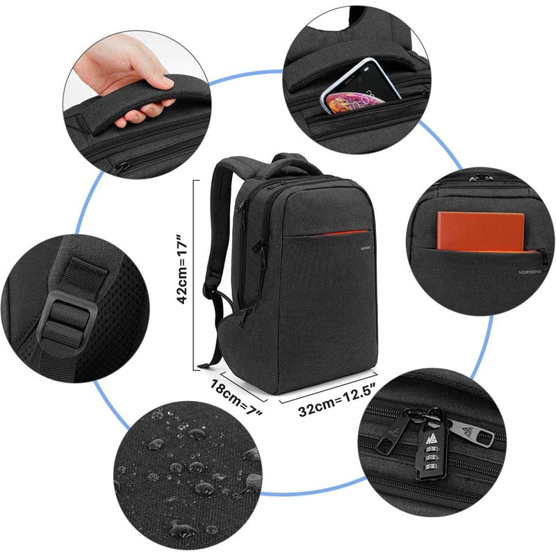 Environmental Friendly Laptop Backpack: 19.29x 11.8 x 5.43 inch. Multiple divider pockets, easy for holding 15.6 Inches laptop, water bottle, readers and a bunch of other items, Pad, journal, pens and pencils, Phone.